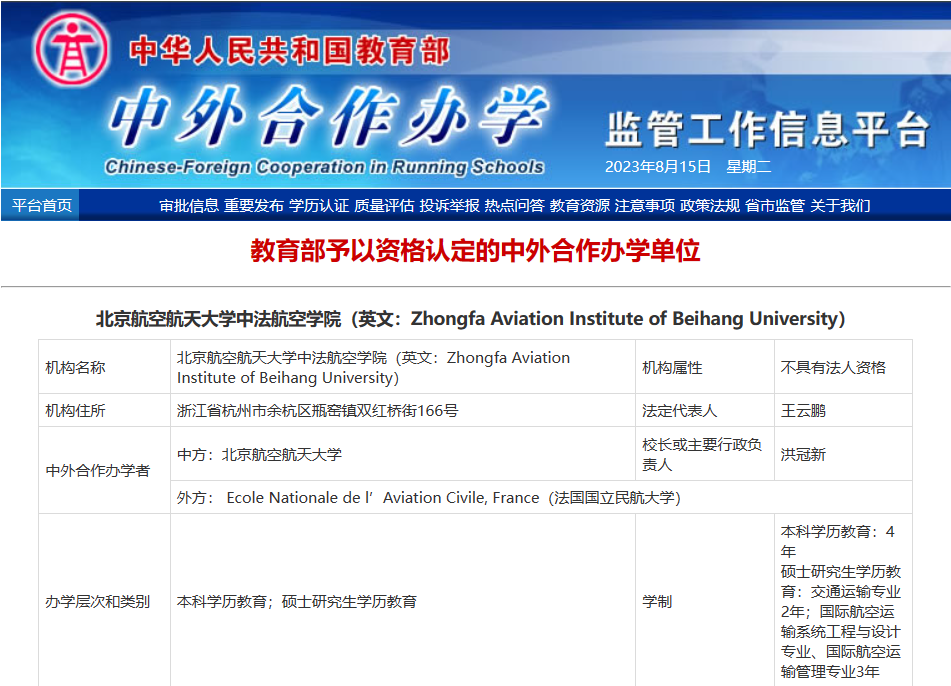 Le 22 avril 2023, le Ministère de l'Éducation chinois a ratifié la création de l'Institut sino-français d'aviation civile Beihang-ENAC.