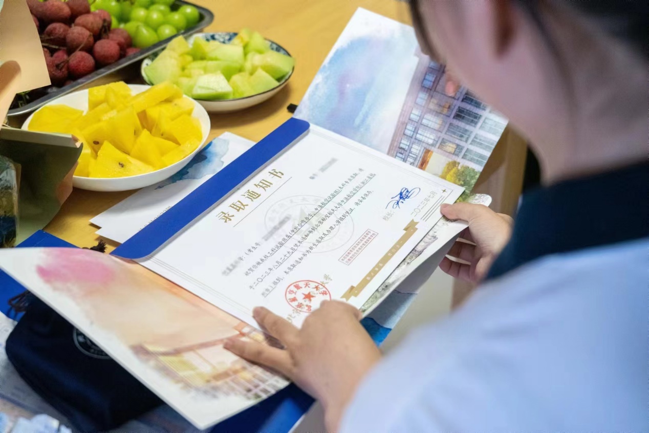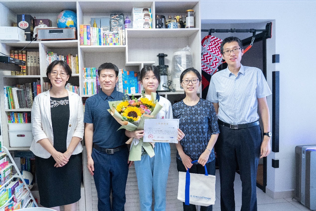 Madame HONG Guanxin et monsieur DU Pengcheng, doyen adjoint de l'institut, ainsi que le postier, se sont rendus chez mademoiselle HE Jinhan, candidate de Pékin, pour lui remettre son avis d'admission, en lui exprimant leurs vifs félicitations et encouragements et en lui souhaitant un avenir brillant et prometteur.