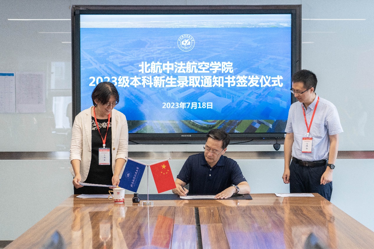L'Institut sino-français d'aviation civile Beihang-ENAC (ZFAI) recrute des étudiants pour la première fois en 2023. Les premiers résultats d'admission sont rendus publics. Le 18 juillet, à 9h du matin, monsieur WANG Yunpeng, président de l'Université Beihang, s'est présentéà la cérémonied'admission de l'université pour signer les avis d'admission à l'adresse des candidats de Pékin admis par ZFAI.