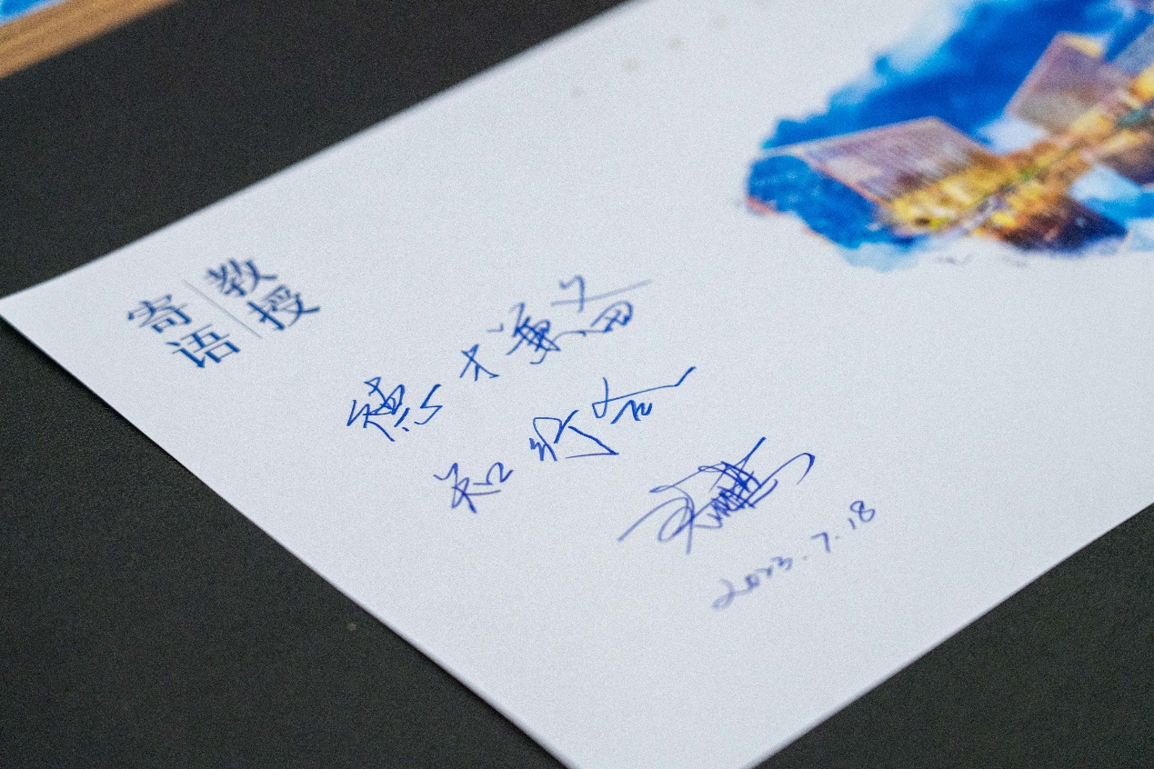 Le président a également autographié la devise de l'université« intégrité morale et compétence professionnelle, unité des savoirs et de l'action ». Il voulait par ce geste faire passer un message de vœux et d'espoir à l'ensemble de la promotion 2023.