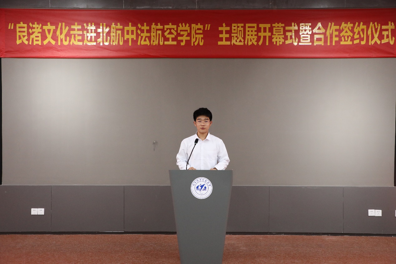 Le 25 octobre dans l'après-midi, la cérémonie d'ouverture de l'exposition « La culture de Liangzhu entre dans le campus de l'Institut sino-français d'Aviation civile Beihang-ENAC » s'est déroulée avec succès dans le centre de conférences du campus. TANG Liyu, membre du Comité permanent du comité du Parti de l'arrondissement de Yuhang et le vice-préfet de Yuhang, YANG Xiaoping, vice-présidente du conseil administratif de la zone de gestion des sites archéologiques de Liangzhu, SHEN Qing, secrétaire du comité du Parti du bourg de Pingyao, MA Dongfeng, directeur général du musée de Liangzhu (Institut de Liangzhu), XU Laiying, PDG de l'entreprise Hangzhou Yuhang Cultural Tourism Investment Group Co., Ltd., YING Hangjun, secrétaire général de la Fondation pour la protection et la recherche sur la culture de Liangzhu de Yuhang, ont assisté à l'événement. En plus, plus de 200 personnes de notre institut ont participé à l'événement, dont HONG Guanxin, directrice de l'institut et les autres membres du conseil d'administration, les étudiants de premier cycle et des enseignants.