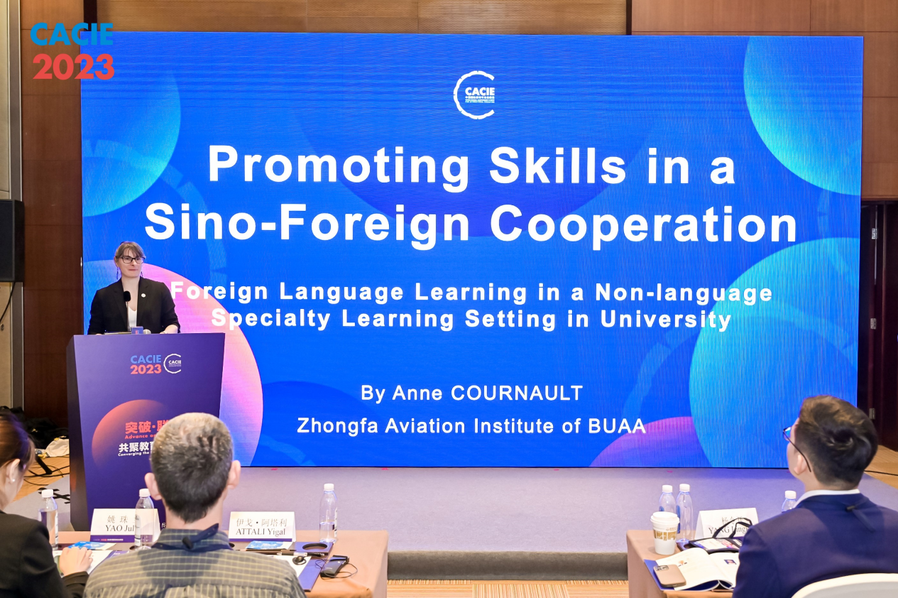 Le 28 octobre au matin, Mme. Anne COURNAULT a participé au séminaire sur la coopération sino-étrangère et l'apprentissage des langues à l'ère numérique et a donné une présentation sur le thème « Amélioration des compétences des étudiants des établissements sino-étrangers : l'apprentissage de la langue étrangère des étudiants de disciplines non linguistiques aux établissements d'enseignement supérieur », en analysant spécifiquement les moyens d'apprentissage des langues des étudiants dans un institut d'ingénieurs sino-étranger et comment l'apprentissage des langues aide les étudiants à développer des qualités telles que la communication interculturelle, la pensée analytique, l'innovation et la créativité.