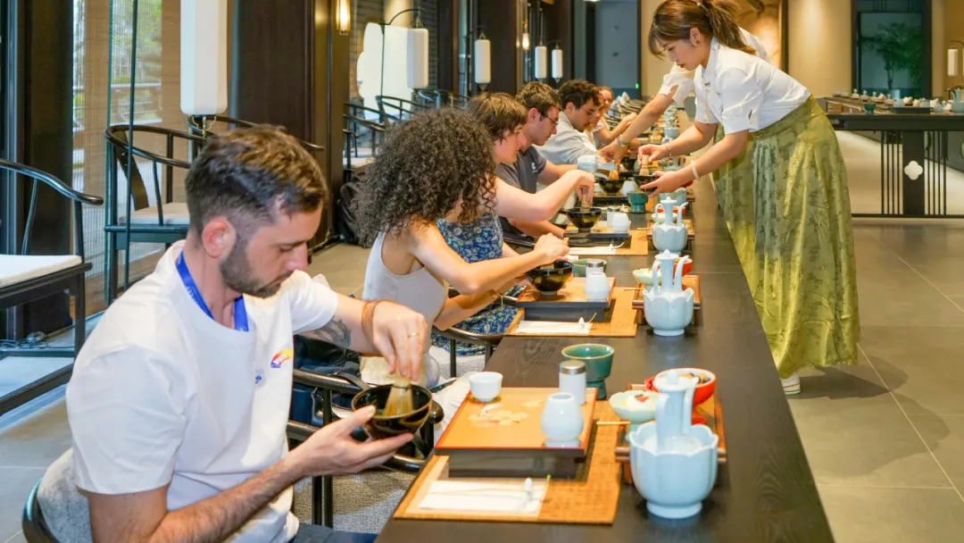 △ Lors de l’atelier du Dian Cha « Rêve sur les sentiers de montagne » tenu au parc culturel du thé de Jingshan, les élèves français ont eu la chance de savourer l’élégance subtile et le charme profond de l’art millénaire du thé chinois.
