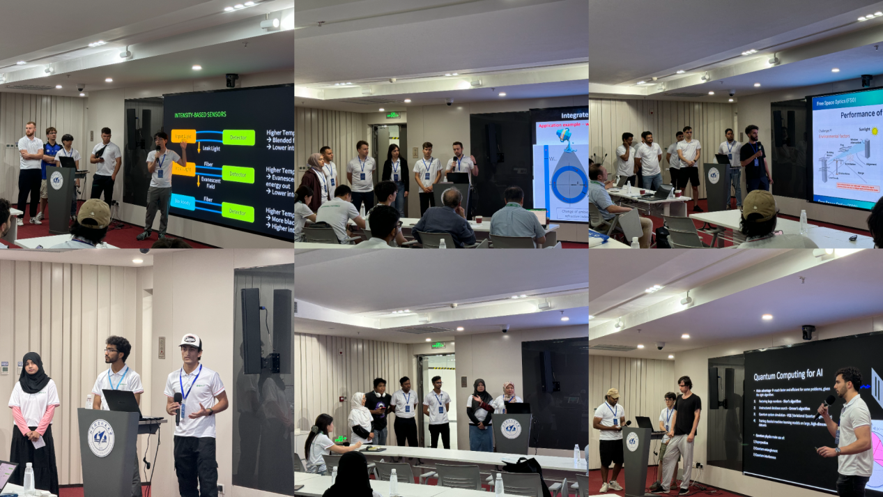 Lors des exposés en groupe, six équipes ont approfondi des sujets de pointe : (1) détection de température par fibre optique et potentiel de l’IA agentive pour le traitement des données ; (2) état de l’art des puces photoniques intégrées pour la surveillance environnementale ; (3) étude comparative FSO vs VLC, avec focus sur la compensation de fortes turbulences et la réception à diversité spatiale ; (4) avancées du calcul photonique pour atténuer la crise énergétique de l’IA, comparaison des performances puces photoniques vs puces électroniques ; (5) systèmes d’auscultation structurelle IA-photonique, synergie des capteurs à fibre distribuée et des réseaux LSTM pour la santé des infrastructures ; (6) optique quantique, préparation des sources de photons intriqués en fréquence et perspectives pour la communication quantique. Ces rapports de haute qualité attestent d’une compréhension solide du champ IA × photonique et des résultats probants de l’École d’été en formation de talents polyvalents et innovants.